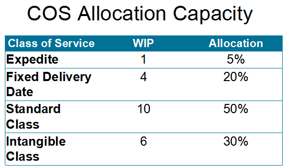 上图为软件开发看板中,针对不同服务类型的产能分配。值得注意的是,该产能分配在实际过程中,可根据具体的情况,适当的动态调整。比如,由于业务季节性的原因,预计后续一段时间的固定交付日期任务会比较少,这个时候可以将一部分的产能暂时交给标准类的任务。