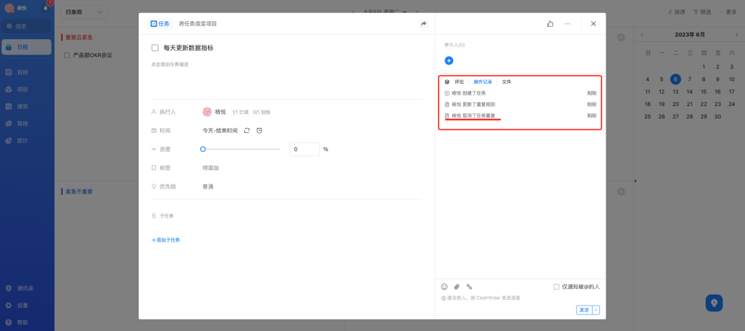 任务设置了重复规则,在关闭重复规则的时候没有操作记录,现增加了操作记录,关闭重复功能时,增加操作记录 XXX 取消了任务重复。